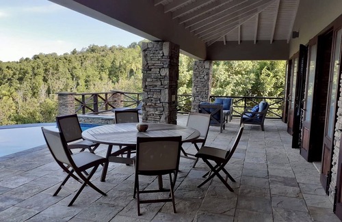 The kitchen in the villa is fully equipped for self catering and has all the amenities of home to whip up many meals. The open air kitchen plan allows views to the back garden with more jungle views of Dominica or dine Alfresco on the front covered terrace overlooking the ocean.